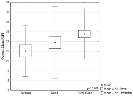 In terms of living conditions, the difference in the value of the mean total FSFI was statistically significant (p < 0.001). For the average living conditions, an FSFI of 22.1 ± 5.3 was reported, and for very good living conditions—25.5 ± 5.1. The results are presented in Figure 2.