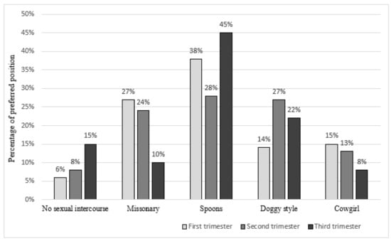 When we compared all three trimesters of twin pregnancies, no statistically significant changes were found in the mean FSFI score. Moreover, no difference regarding sexual position preferences occurred. In all trimesters of twin pregnancy, women were most likely to choose intercourse in the spoons position, which was confirmed by 38%, 28%, and 45% of women choosing this option in the first, second, and third trimesters, respectively. The other positions often mentioned by the patients were missionary, doggy style, and cowgirl positions. The study results also showed a growing trend in the number of women not having sex at all over the course of a twin pregnancy. In the first trimester, 6% of surveyed women reported no sexual intercourse week-by-week. This percentage grew to 8% in the second trimester and to 15% in the last trimester of pregnancy (Figure 3).