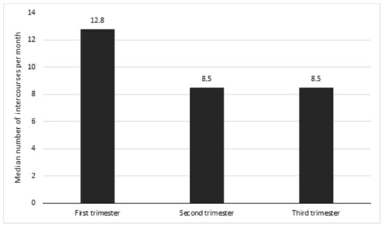 The frequency of sexual intercourses per month depending on the trimester of pregnancy was analyzed as well. However, this parameter was taken into consideration only in sexually active women. The median number of intercourses per month was the highest in the first trimester of pregnancy, rounded up to 13 intercourse per month (12.8) and was significantly higher than in the second and the third trimester (p < 0.05, p < 0.05). For the second and third trimesters, the median was the same—rounded up to nine intercourses per month (8.5) (p > 0.05) (Figure 4).