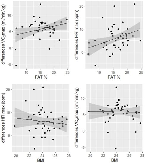 The variance in differences in VO2max obtained from treadmill and cycle ergometer testing was significantly explained by BMI, FATP, FFM and training experience in the group >40 years of age with an R2 of 0.25. It has previously been shown that BM and BC are related to aerobic capacity and that the physiological ability to consume oxygen is negatively associated with FM [,,]. However, to the best of our knowledge, this is the first study to demonstrate an association between BC, BMI and the differences in treadmill and cycle ergometry CPET results. We hypothesize that this relationship may be caused by the physiological differences between cycling and running. Cycling is a non-weight-bearing activity, with far less eccentric activity than during running []. Therefore, BM and BC may be more important in treadmill testing than in cycle ergometry. It is unclear why the observed differences are better explained by anthropometric variables in the older group compared to the younger group. We may suspect that the difference in the younger population would be better explained by other factors, perhaps by training volume in cycling or running, which were not evaluated in this study. It is also possible that the differences in BC, especially FFM, reflect differences in cardiovascular function, which might play a more important role in older triathletes and could have a different importance in cycle ergometry and treadmill testing [,]. Differences in HRmax were significantly explained by BMI and FATP in the older population. It has previously been shown that HRmax is related to BC and BMI, but it remains unclear what the cause for this relationship is or why BC is related to the differences in HRmax between treadmill and cycle ergometry [].