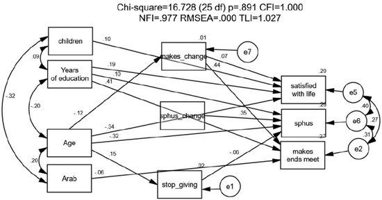 After estimating characteristics that explain self-rated health, the ability to make ends meet, and life satisfaction as a function of a range of demographic indicators, changes in the other explained variables, and the predisposition to stop giving care, we now turn to the last part of our empirical model. In this stage, we attempt to determine: (a) whether the three explained variables mentioned above are correlated; (b) whether a different pattern of explanation pertains to each variable, and (c) whether other variables mediate between the exogenous variables and the explained ones. Pearson correlations were used to test for correlations among the study variables. The AMOS structure equation modeling (SEM) program, version 25, was run to create a path analysis using the maximum-likelihood method [69,70]. SEM was used to explore paths of the relation between the socio-demographic attributes, the interactions, the changes in variables, the ‘stop giving care’ (cessation of care) explanatory variable, and the outcome variables. The values shown are β values that relate to correlations between variables that were found to be significant (Figure 2).