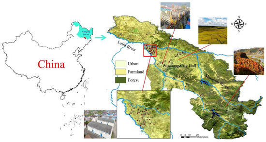 The study area is located in the riverside source field of Wuchang, in northeastern China, at 126°58′ and 127°07′ E longitude and 45°02′ and 45°05′ N latitude, covering approximately 100 km2. This area, located at the intersection of two rivers, is bound to the west by the Lalin River and the east by the Mangniu River (Figure 1). A large area of rice is planted in the area, and the north is mountainous forest land. The urban area is mainly within five kilometers of the Wuchang City Hall. At the intersection of the Lalin River and the Mangniu River, there are a large number of villages, animal husbandry farms, and small factories, which mainly engaged in grain, animal husbandry product processing, and metal processing. This is also the key area of the sampling (Figure 1).