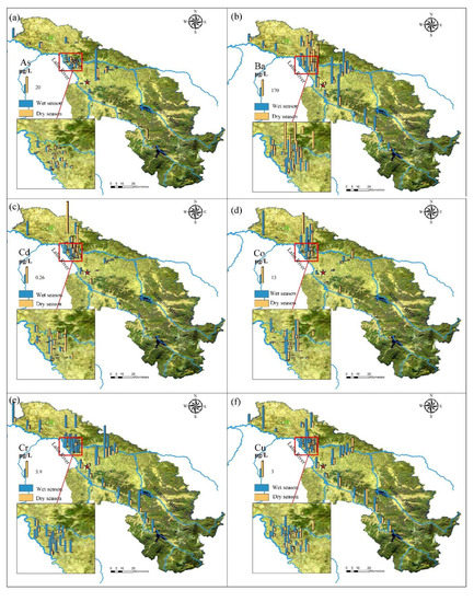 The spatial distribution of groundwater concentrations in the study area differed greatly between the wet and dry seasons (Figure 2), with the concentrations in the former being obviously higher on the whole. Among carcinogenic pollutants, the concentrations of As and Cd showed high levels in the densely populated area (Figure 2a,c). Cr showed a high concentration in the whole sampling points in the wet season while decreased significantly in the dry season (Figure 2e). The highest As and Cr showed in the middle part of the study area while the lower in the north part of the study area. Among non-carcinogenic pollutants, the concentrations of Ba, Co, Cu, Fe, Mn, and Pb showed higher levels in the wet season than the dry season, while the highest concentrations of Ni and Zn in the dry season were higher than in the wet season (Figure 2i,k). Non-carcinogenic pollutants were mostly distributed in densely populated areas. Among them, the concentration of Co was high at some points in the urban area (Figure 2d), while others showed a low concentration. What’s more, Ba, Cu, and Pb also showed a high concentration along the Lalin River (Figure 2b,f,j). Compared with people and factories distribution, concentrations near the river showed stronger seasonal differences, that is, the concentration in the wet season was much higher than that in the dry season. The temporal distribution of Zn along the river was just the opposite, and it was higher in the dry season (Figure 2k).
