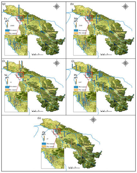 Spatial distribution of concentrations of the heavy metals: (a) As, (b) Ba, (c) Cd, (d) Co, (e) Cr, (f) Cu, (g) Fe, (h) Mn, (i) Ni, (j) Pb, (k) Zn.