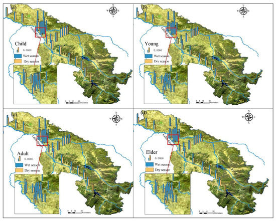 Based on the HHRA results (Figure 3), the health risks varied seasonally and with age, which occurred in the following order: child> elder > young > adult. During the wet season, the average R value of a child, elder, young, and adult was 0.0132, 0.0124, 0.0111, and 0.0110 a−1, respectively, while in the dry season 0.0070, 0.0050, 0.0040, and 0.0039 a−1, respectively (Figure S2). However, there was consistency in the overall health risks, that is, the R values for all of the sampling points were far higher than the limits (0.0001 a−1), the high values occurred along the upper reaches of the Lalin river. In the dry season, health risks of 23 sampling points were acceptable, which were mainly distributed in the middle of the study area. Other points were higher than the reference value, and the concentrations were basically evenly distributed (Figure S3).