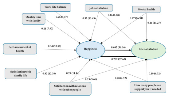 Table 6 shows the path estimates and their associated t-values for the variables in the path model. Life satisfaction is affected by five variables: job satisfaction, mental health, Social support network, satisfaction with relationships with others, and happiness. Nine variables influence happiness, including job satisfaction, mental health, Social support network, satisfaction with relationships with others, satisfaction with family life, self-assessment of health, quality time with family, work–life balance, and life satisfaction. The path model identifies direct reciprocal relations between life satisfaction and happiness for working people.