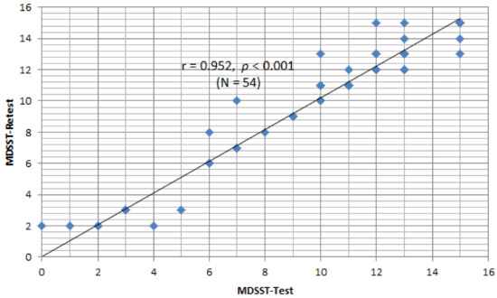 The retest for the web-based MDSST was performed two weeks later with 54 of the participants from the initial evaluation. The Pearson correlation analysis showed that the reliability between the initial evaluation and the reevaluation was r = 0.952 with p = 0.000, indicating a very reliable linear correlation (Figure 1).