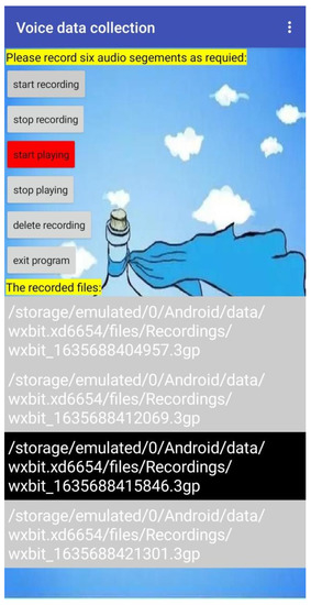 Two ways could be used to collect health information in this system: one was to design a mobile app for health information collection, and the other was to collect questionnaire and scale data by cloud form. After installing an information acquisition app, the smartphone becomes a data acquisition intelligent terminal, which can save the cost of purchasing data acquisition equipment. In this study, a mobile app was mainly used to collect voice data. The development platform was Google’s App Inventor platform. The designed app operation interface is shown in Figure 4.