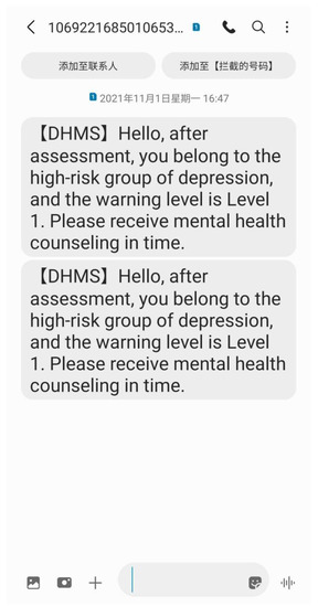 Figure 6 shows a health intervention message sent to customers by the SMS intervention platform. The mobile phone model receiving the SMS was Samsung Note20 Ultra 5G. The picture shows a screen capture of the mobile phone after receiving the SMS. DHMS refers to the system and is the acronym of “depression health management system”. For key groups, multiple text messages can be sent to attract attention.
