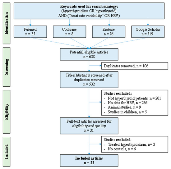 An initial search produced a possible 638 articles (Figure 1). Removal of duplicates and use of the selection criteria reduced the number of articles reporting the evaluation of HRV in untreated hyperthyroidism to 22 articles [37,38,39,40,41,42,43,44,45,46,47,48,49,50,51,52,53,54,55,56,57,58]. All included articles were written in English.