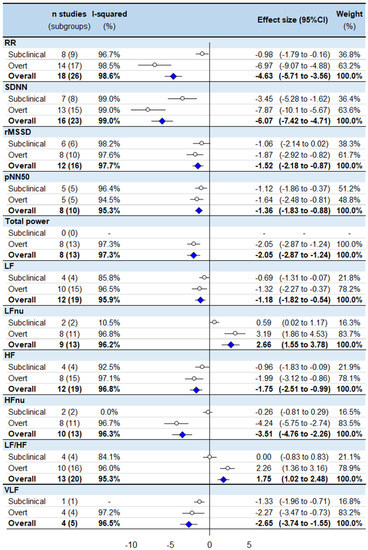In comparison to healthy controls, the following HRV parameters were decreased in both overt hyperthyroidism and in subclinical hyperthyroidism, respectively: RR-intervals (ES = −6.97, 95% CI −9.07 to −4.88, and −0.98, −1.79 to −0.16), SDNN (−7.87, −10.08 to −5.67, and −3.45, −5.28 to −1.62), pNN50 (−1.64, −2.48 to −0.8, and −1.12, −1.86 to −0.37), LF power (−1.32, −2.27 to −0.37, and −0.69, −1.31 to −0.07), HF power (−1.99, −3.12 to −0.86, and −0.96, −1.83 to −0.09), and VLF power (−2.27, −3.47 to −0.73, and −1.33, −1.96 to −0.71), whereas LFnu increased (3.19, 1.86 to 4.53, and 0.59, 0.02 to 1.17). Most of the aforementioned parameters had ES that was twice as high in overt compared to subclinical hyperthyroidism. Some HRV parameters were only modified in overt hyperthyroidism: lower RMSSD (−1.87, −2.92 to −0.82), TP (−2.05, −2.87 to −1.24) and HFnu (−4.24, −5.75 to −2.74), and higher LF/HF ratio (1.75, 1.02 to 2.48), while those parameters did not differ in subclinical hyperthyroidism (Figure S5). All meta-analyses had a high degree of heterogeneity (I2 > 80%), except for parameters explored by a few studies in subclinical hyperthyroidism (LFnu, HFnu, VLF).