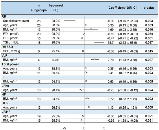 Meta-regressions of significant factors influencing heart rate variability in untreated hyperthyroid patients (exhaustive meta-regressions are presented in Figure S5). RR: RR intervals (or normal-to-normal intervals—NNs), BMI: body mass index, FT4: free thyroxine, FT3: free triiodothyronine, TSH: thyroid-stimulating hormone, RMSSD: the square root of the mean squared difference of successive RR intervals, SBP: systolic blood pressure, VLF: very low frequency, LF: low frequency, LFnu: low frequency-normalized units, HF: high frequency, HFnu: high frequency-normalized units, LF/HF ratio: low frequency/high frequency ratio.