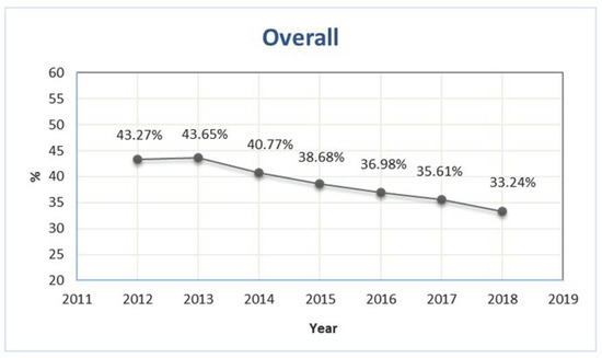 The number of older patients exposed to at least one PIP was 418,537 and 429,670 in 2012 and 2013, respectively, corresponding to 43.3% and 43.7% of the total number of older outpatients with at least one prescription (Figure 1). During the study period, the prevalence showed a sharp decrease, reaching 33.2% in 2018 (Figure 1).