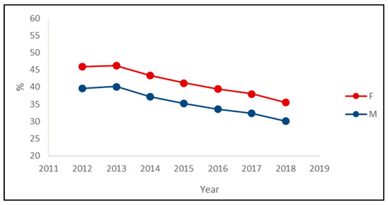 Prevalence of exposure to at least one potentially inappropriate prescription among the drugs’ users by the sex of outpatients older than 65 years in Piedmont in the period 2012–2018.