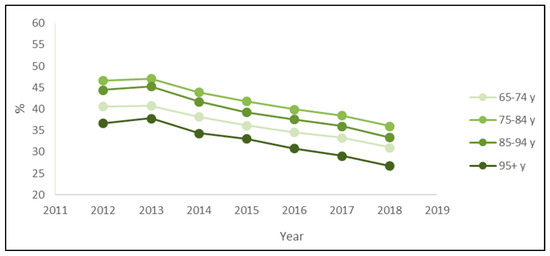 Among these subjects with PIPs, the proportion of males was quite stable (range 38.6-39.0%) across years. The mean age showed a slight increase, from 75.7 in 2012 to 76.1 in 2018, as well as the proportion of subjects older than 80 years old, from 26.1% in 2012 to 28.2% in 2018 (Table 1). The median number of medications per patient was six, without relevant variation during the study period; the distribution according to polytherapy classes remained also stable (Table 1).