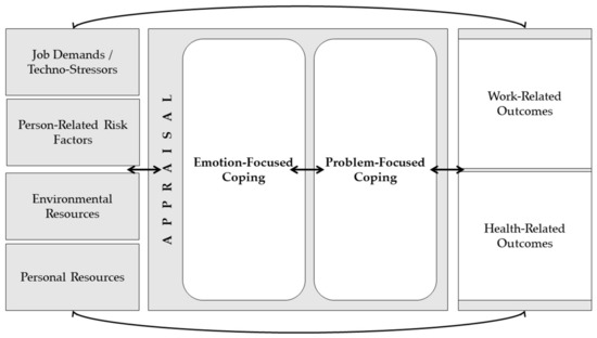 Only five studies [58,84,92,93,98] addressed appraisal, i.e., the process that decides whether potential stressors are actually perceived as threatening or not [17]. The knowledge of available resources influences the appraisal. Similarly, coping strategies are also dependent on resources [16]. Several authors followed this approach and examined how employees appraised stress caused by email traffic [56,98] and found that framing technology as an opportunity or a threat shaped the consequences of being exposed to technostress creators [84]. Challenge appraisals were associated with problem-focused coping strategies and positive outcomes, while hindrance appraisals were associated with emotion-focused coping strategies and negative outcomes [92,93].