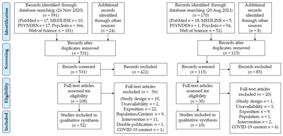 Searching the databases resulted in an initial total of 591 identified records. A further 25 records were identified through a manual search and based on the references of the included studies. Of these 616 identified records, 531 records were screened based on their titles and abstracts by one author (E.R.) after duplicates were removed. A total of 108 studies were identified as eligible for full-text screening, which was conducted by two authors (E.R. and J.-C.F.). Finally, 52 studies were identified and included. According to Landis and Koch [51], the inter-rater reliability among the authors was substantial based on Cohen’s kappa (κ = 0.65). During the update in August 2021, 115 further records were identified, of which 85 were excluded after screening titles and abstracts (E.R.). The remaining 30 records were included in the same full-text screening procedure (E.R. and J.-C.F.), resulting in an inclusion of ten additional records for the qualitative synthesis of this review. Cohen’s kappa of κ = 0.65 indicates a substantial inter-rater reliability for the update process as well [51]. All deviations were discussed individually between the authors until agreement was reached. As a result, a total of 62 studies were included in the qualitative synthesis of this scoping review. A visualisation of the study selection process based on the Preferred Reporting Items for Systematic Reviews and Meta-Analyses (PRISMA) [52] is provided in Figure 2.