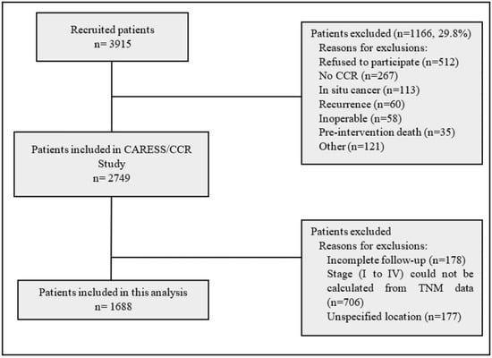 This prospective observational cohort study was carried out at 22 hospitals (all belonging to the Spanish National Health System) located in nine provinces of Spain. The study included 2749 patients who were diagnosed for the first time as CRC and underwent surgery between June 2010 and December 2012, and who were then followed up for five years. Neither recurrences nor metastases have been included (Figure 1). The patients were recruited prospectively, and relevant sociodemographic and clinical information was obtained from the hospital databases and by self-reported questionnaires [,].