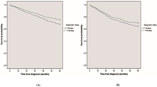 The initial delay, from the appearance of symptoms until the patient consults with the referring physician, is termed the patient-dependent delay. The subsequent passage of time, until diagnostic tests are performed and the pathological results obtained, is termed the diagnostic delay []. Previous studies of cohorts of patients have analyzed the factors associated with both types of delay [,]. Some authors have reported that late diagnosis does not directly affect mortality from CRC, which is related to other clinical and sociodemographic factors [,]. According to a recent article concerning a retrospective cohort study conducted at a single hospital, short diagnostic delays are significantly associated with a poorer prognosis, an effect that is called the “waiting time paradox” []. In view of these considerations, our study aim is to evaluate the overall survival rate of CRC patients in relation to diagnostic delay, based on the prospective analysis of a large cohort (CARESS/CCR Study) [].