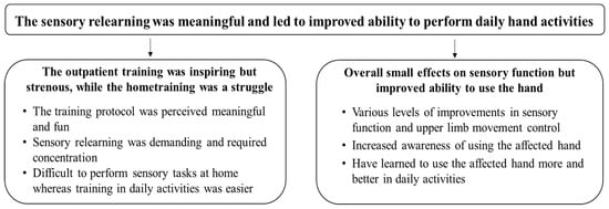 From the analysis, one overall theme ‘Sensory relearning was meaningful and led to improved ability to perform daily hand activities’ and two categories with six subcategories emerged (Figure 1). The first category ‘The outpatient training was inspiring but strenuous, while the home training was a struggle’ reflected participants’ perception of the training and included three subcategories. The second category ‘Overall small effects on sensory function but improved ability to use the hand’ reflected their perceived effects of the training and included three subcategories. To validate the findings, the results are illuminated by quotations from the participants.