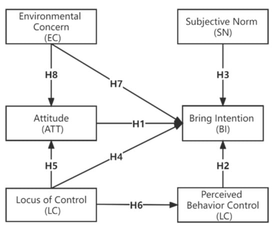 Behavioral intention and actual behavior share the same influential factors, but compared with actual behaviors, behavioral intention is more correlated with the influential factors [30]. Therefore, this study analyzes the influential factors on consumers’ intention to bring a reusable bag for shopping. Based on the existing literature of TPB application in pro-environmental behaviors, five variables are analyzed in this study, including the three basic variables of TPB, i.e., attitude (ATT), perceived behavioral control (PBC), and subjective norm (SN), and two extended variables, i.e., locus of control (LC) and environmental concern (EC).