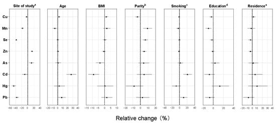 3.3. Associations between Elements in Whole Blood and Maternal Characteristics