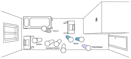 The interprofessional psychiatric consultations in Ward A had an average duration of approximately 6 min (mean) per patient and varied from 1 to 22 min. In general, they took place in the patient’s room (Figure 1). Most of the patients were accommodated in a single or a double room; and if they were visited for the consultation by the interprofessional care team in a double room, the other patient had to leave. During the consultations in Ward A, the members of the interprofessional care team stood around the patient while most of the patients were sitting on their bed or on a chair. Therefore, the psychiatrist/consultant leading the conversation and the group of junior physicians stood nearest to the patient. The other team members, such as the nurses and the psychologist, positioned themselves in the back of the room near the door.