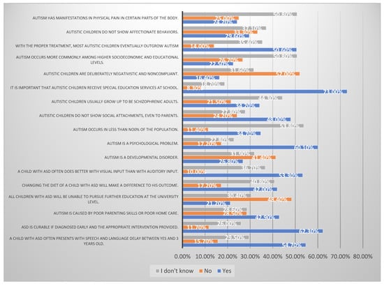 In Figure 1, the percentage of participants who answered the knowledge items correctly ranged between 11.7% and 73.0%. The lowest percentages of correct answers were items related to knowledge about ASD treatment and etiology. Only 11.7% of the participants understood that ASD is not curable, even if it was diagnosed early and the appropriate intervention was provided. Only 14.0% of the participants knew that ASD treatment does not cure autism. The highest percentages of correct answers were items related to knowledge about the symptoms and behavior of ASD children. The majority of the participants (73.0%) were aware that ASD children require special education services at school; 54.7% of them knew that children with ASD often present with speech and language delays between 2 and 3 years of age, and 53.3% knew that children with ASD often do better with visual input than with auditory input.