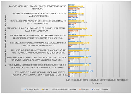 The majority of participants agreed that government funding should be made available to help preschools hire more staff to meet the needs of these children, that the government should allocate more resources to providing services for children with special needs, and that all preschools should have special education teachers and therapists to provide services to children. Almost all prior studies concluded that the government had a vital role to play in increasing awareness of ASD and assisting families with autistic patients [9,29,31,41,42,43,44].