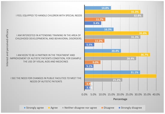 Four items were utilised to explore participants’ interest and perceived efficacy towards autism management. The participants showed the highest degree of agreement that there is a need for change in public facilities to meet the needs of autistic patients (72.2%), followed by the idea that they are keen to be a partner in the treatment and improvement of autistic patient’s conditions, for example, the use of visual aids and medicines (57.1%). Figure 3 presents the degree of agreement concerning participants’ interests and perceived efficacy towards autism management.