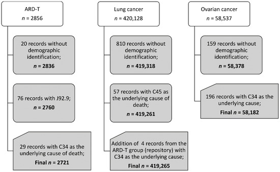 We found that there were 2721 pooled ARD-T, 419,265 lung cancer, and 58,182 ovarian cancer death records between 2000 and 2017. Figure 1 presents the study death data structure according to the diagnosis. Supplementary Table S1 displays the number of pooled ARD-T, and lung and ovarian cancer deaths registered for each of the 29 H-ASB (and for all other Brazilian municipalities (n = 5539).