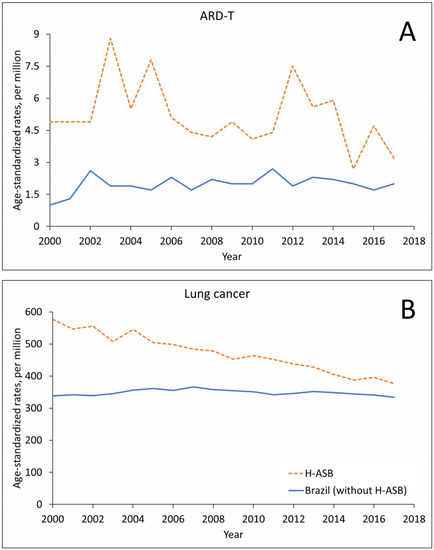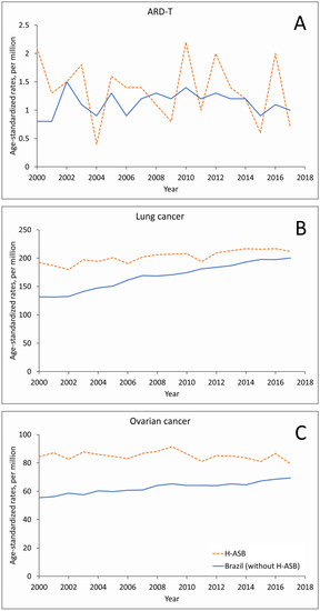 The following supporting information can be downloaded at https://www.mdpi.com/article/10.3390/ijerph19063656/s1, Table S1: Population (2010) and number of deaths with records of ARD-T, and lung and ovarian cancer in the H-ASB municipalities (and respective Brazilian State), Brazil, 2000–2017; Table S2: Crude and age-standardized rates (ASRs, per million) in the 29 municipalities (H-ASB) and in Brazil (without H-ASB) by year of death in men 30 years and over in Brazil, 2000–2017; Table S3: Crude and age-standardized rates (ASRs, per million) in the 29 municipalities (H-ASB) and in Brazil (without H-ASB) by year of death in women 30 years and over in Brazil, 2000–2017.