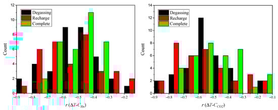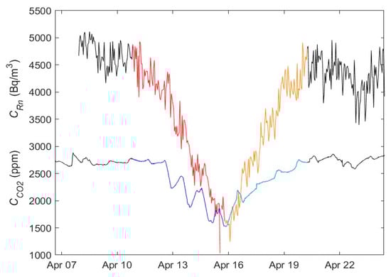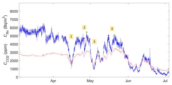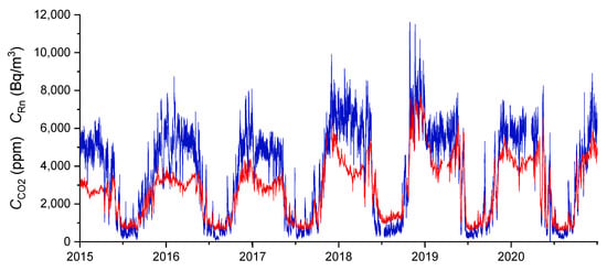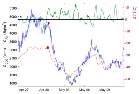The study of correlations between the temperature gradient and gas concentrations has been carried out individually both for degassing and recharging events, as well as for the whole period comprising both processes. For the correlations between CRn and ∆T, and between CRn and CCO2, hourly measured values have been used because the radon concentration has been measured hourly. In contrast, for the correlations between CCO2 and ∆T, all corresponding values have been selected, as 15-min values were available.