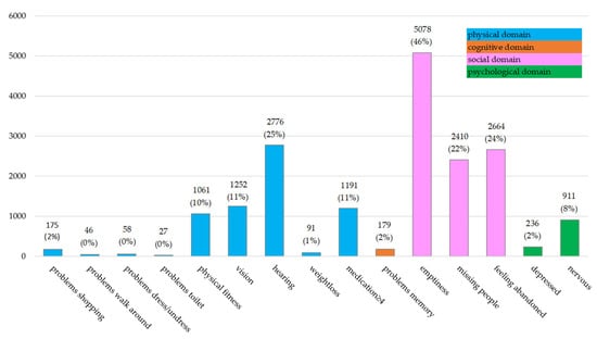 According to the GFI, Frailty was present in 13% (1463/11,145) of the participants. Distribution of GFI levels across the domains of function loss is reported for frail and non-frail participants in Figure 1. The three items of the social domain together represented 56% of all problems reported. The physical domain, consisting of nine items, represented 37% of all problems reported. This indicates that the GFI scores were characterized by problems in the social domain, and to a lesser extent in the physical domain. Compared to the three other domains, the largest proportion of problems reported by frail participants (51%; 3670/7106) were in the social domain. Non-frail participants reported an even larger proportion of problems in the social domain, relative to the other domains, i.e., 59% (6482/11,049). Participants reported 6% of the GFI item scores in the psychological domain. Of these 1147 participants, 71% (n = 820) were frail. The number of participants that scored each GFI item is presented in Figure 2, which shows that most participants reported problems concerning experiencing emptiness around them (46%), loss of hearing (25%), feeling dependent (24%), and missing people around them (22%).