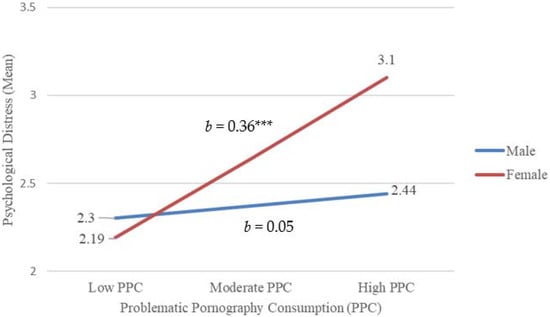Interaction between problematic internet pornography use and gender in predicting psychological distress (n = 144). Note: *** p < 0.001.