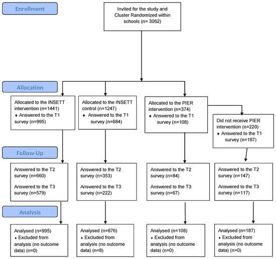 Figure 1 presents the data collection time frame and numbers. Baseline data were collected mainly before the implementation of the INSETT and PIER interventions between August 2019 and January 2020. The post-intervention (T2) data collection took place from February (9th grade) to May 2020 and the follow-up (T3) data from May (9th grade) to October 2020. Adolescents responded online to the questionnaires in their mother tongue, guided at baseline by researchers and teachers in classrooms. Due to the COVID-19 school closures, the T2 and T3 data collections were guided online. To secure anonymity, a secure online survey tool (Lime Survey GmbH) was used, and all identifiable information was stored separately from the research data. To avoid attrition in the post-intervention (T2) and follow-up (T3) surveys, students received a personal invitation and two reminder letters via e-mail. For students, there were no exclusion criteria and all signing the informed consent could participate. Online INSETT teacher training material was provided to waiting-list control schools in January 2021.