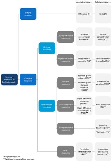 - Regidor, E. Measures of health inequalities: Part 2. J. Epidemiol. Commun. Health 2004, 58, 900–903. [Google Scholar] [CrossRef] [PubMed]