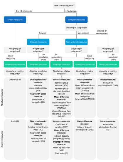 Ordered measures can be calculated for inequality dimension with subgroups that have a natural ordering, such as wealth quintiles. They can be grouped into two categories: disproportionality measures, which express inequality as a function of shares of the health indicator compared to shares of the population, and regression-based measures, which make use of an appropriate regression model to estimate the association between the rank of subgroups and the health indicator [10,24].