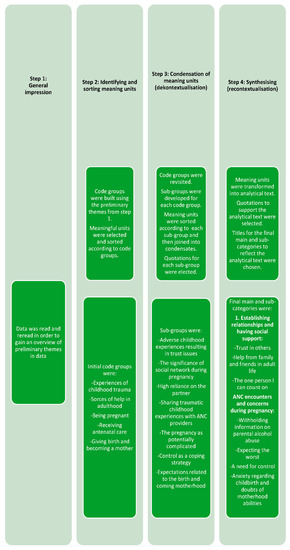 Growing up with alcoholic parents is a sensitive issue, especially when expecting a child of your own. The interviews were carried out by V.d.L., who is a certified psychotherapist and has numerous years of professional experience working with women with different psychosocial vulnerabilities. Furthermore, all women participating in the study were recruited from an NGO, which provided counseling and therapy for adults who had grown up with alcoholic parents. Thus, participants had access to help in case they found the interview topics distressing.