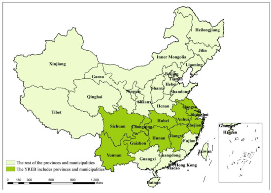 Promoting the development and construction of the Yangtze River economic belt (YREB) is an important national strategy of China. That is, it prioritizes regional green development and ecological green development at home and abroad, promoting coordinated, balanced, and innovation-driven high-quality development [1]. The YREB spans Eastern, Central, and Western China, including 11 provinces (municipalities) such as Shanghai, Jiangsu, Zhejiang, Anhui, Jiangxi, Hubei, Hunan, Chongqing, Sichuan, Yunnan, and Guizhou (as shown in Figure 1). It is an important support for China’s economy.