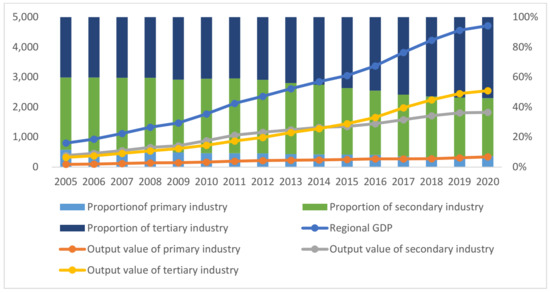 In 2020, the regional GDP exceeded CNY 47 trillion, accounting for 46.5% of the country. Figure 2 shows the proportion and change trend of three industries in the YREB from 2005 to 2020. In 2020, the three industries in the YREB accounted for 7.23%, 38.74%, and 54.02% of the regional GDP, respectively. The industrial structure shows a trend of continuous upgrading.