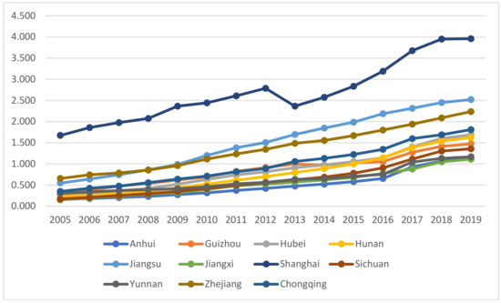 All the original data are from the official websites of China Statistics Bureau (http://www.stats.gov.cn/tjsj/ndsj/, accessed on 15 February 2022); Anhui Statistics Bureau (http://tjj.ah.gov.cn/ssah/qwfbjd/tjnj/index.html, accessed on 15 February 2022); Guizhou Statistics Bureau (http://stjj.guizhou.gov.cn/, accessed on 15 February 2022); Hubei Statistics Bureau (http://tjj.hubei.gov.cn/tjsj/sjkscx/tjnj/qstjnj/, accessed on 15 February 2022); Hunan Statistics Bureau(http://tjj.hunan.gov.cn/tjsj/tjnj/, accessed on 15 February 2022); Jiangsu Statistics Bureau (http://tj.jiangsu.gov.cn/col/col83749/index.html, accessed on 15 February 2022); Jiangxi Statistics Bureau (http://tjj.jiangxi.gov.cn/col/col38595/index.html, accessed on 15 February 2022); Shanghai Statistics Bureau (http://tjj.sh.gov.cn/tjnj/index.html, accessed on 15 February 2022); Sichuan Statistics Bureau (http://tjj.sc.gov.cn/scstjj/c105855/nj.shtml, accessed on 15 February 2022); Yunnan Statistics Bureau (http://stats.yn.gov.cn/tjsj/tjnj/, accessed on 15 February 2022); Zhejiang Statistics Bureau (http://tjj.zj.gov.cn/col/col1525563/index.html, accessed on 15 February 2022); Chongqing Statistics Bureau (http://tjj.cq.gov.cn/zwgk_233/tjnj/, accessed on 15 February 2022); and China’s economic and social big data research platform (https://data.cnki.net/, accessed on 15 February 2022).