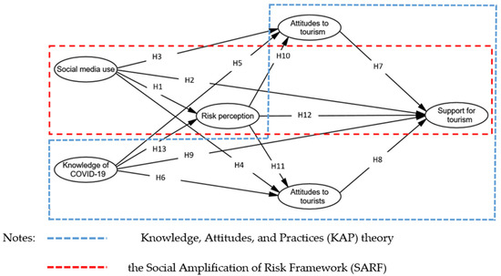 The COVID-19 pandemic was quickly contained in some countries (e.g., China) after strict prevention and control measures were implemented, resulting in the rapid recovery of domestic tourism [8]. However, the revival of domestic tourism has left residents of tourist destinations in a precarious position. In many cases, avoiding COVID-19 hotspots would be comparatively easy for tourists, switching their plans if their destination turned out to be a danger zone. However, for residents, the options are often limited [9]. Given the prolonged incubation period and the asymptomatic nature of COVID-19, residents may have difficulty identifying and avoiding infectious tourists, which leads them to seclude themselves or accept risky tourists [1]. As an essential step to ensure a destination’s tourism sustainability, the role of residents’ support for tourism (SUPT) has been demonstrated in many studies [1,7,10,11]. In the face of the spread of COVID-19 and sporadic outbreaks in some areas, residents’ SUPT has become especially important but has also brought them risk. As a matter of fact, the resistance and hostility of residents towards tourists amidst the COVID-19 era demonstrate a real and substantial risk perception among residents [1]. Thus, research on residents’ RP and its impact on their subsequent attitudes and SUPT amidst the COVID-19 era are urgent and beneficial. Nevertheless, given that the concept of RP stems primarily from consumer behaviour, tourism research has tended to address the issue from tourists’ perspective [12], For instance, the concept of tourism risk perception is often conceptualized as tourists’ subjective feelings, objective evaluation and cognitive of exceeding the threshold portion of the negative consequences [13], and most studies are focused on the impact of tourists’ risk perception on their attitudes and behavioural intention [14,15,16,17]. However, residents’ perspectives of risk perception are absent from the literature [7,18]. In such a case, the social amplification of risk framework (SARF) and knowledge, attitudes, and practices (KAP) theory may be used to investigate the gap in the literature.