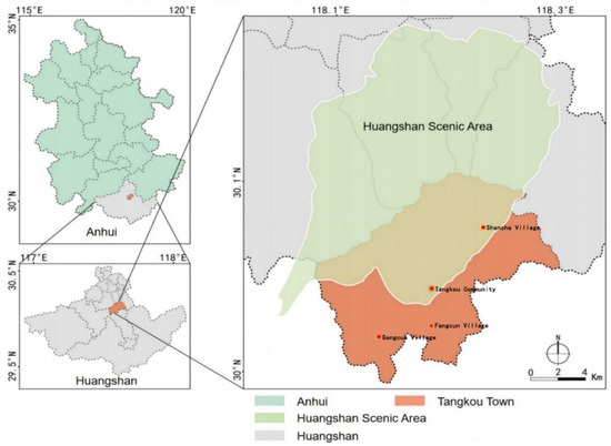 Huangshan Scenic Area (HSA) is situated in the southernmost area of Anhui province and is considered one of the top ten scenic spots in China. As a typical mountain scenic spot, HSA was proclaimed a World Heritage Site in 1989 for its distinctive natural scenery and splendid cultural heritage. HSA is surrounded by several towns, among which Tangkou Town has become the largest tourist reception and distribution centre by its unique geographical location, convenient transportation and well-designed cable car system throughout the scenic area. To date, the area has 28 travel agencies and over 540 catering and accommodation establishments, with more than 19,000 beds in town. COVID-19 has brought a heavy hit to the tourism industry in HSA, but with strong control measures and large-scale vaccination of COVID-19, many domestic tourists choose to enter HSA from Tangkou Town, resulting in a phenomenal domestic tourism increase in HSA. Thus, Tangkou Town was selected as the study area for this study. Tangkou Town consists of three villages and one community: Tangkou Community, Gangcun Village, Fangcun Village and Shancha Village (Figure 2). To maximize the sample’s representativeness and minimize any potential spatial biases, we surveyed all four villages and communities and sized the sample according to the number of households within each village or community (Table 1).