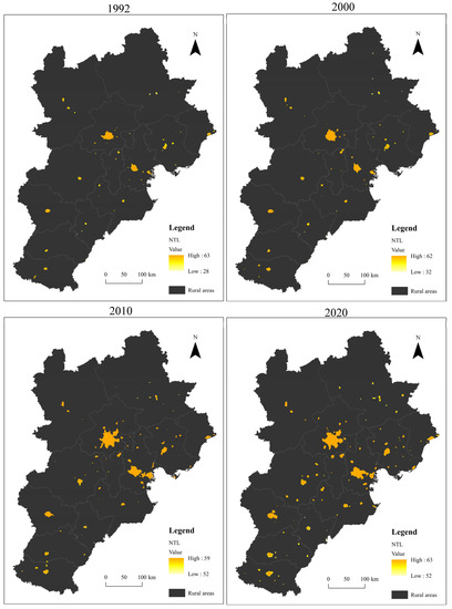 The nighttime light dataset employed in this research comes from a study by Li et al. [16], who generated an integrated and consistent global nighttime light dataset by harmonizing the intercalibrated nighttime light and observations from DMSP/OLS data and the simulated DMSP/OLS-like nighttime light observations from NPP-VIIRS data. The temporal span of the dataset is from 1992 to 2020, while its spatial resolution is 30 arc-seconds, with DN values ranging from 0 to 63. Excluding noise from the aurora, fires, boasts, and other temporal lights, the extended DMSP/OLS dataset shows high sensitivity to the low-intensity lights emitted by urban lights, small-scale residential areas, and traffic flow, which makes it obviously different from a dark, rural background. Research has confirmed that harmonized DMSP/OLS nighttime light data could be used to support studies monitoring the long-term dynamics of human activity, such as urban expansion, carbon emissions, electricity consumption, and light pollution, at local to global scales [16].
