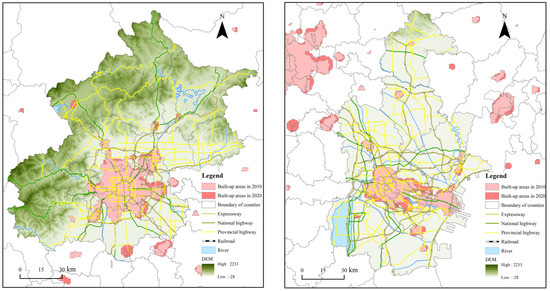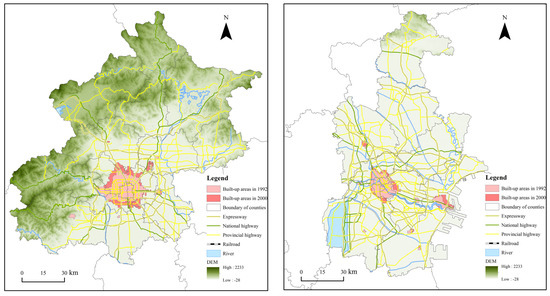 Moreover, basic geographic and urban statistical data are included in this study. Basic geographic data at a 1:1,000,000 scale derived from the Resource and Environment Science and Data Center of Institute of Geographic and Natural Resources Research (https://www.resdc.cn/, accessed on 5 February 2022) are applied to extract the vector boundary of the Beijing–Tianjin–Hebei urban agglomeration. The built-up areas of municipal districts at the prefectural level collected from the China Urban Construction Statistical Yearbook in 1993, 2000, 2010, and 2019 are used for the delimitation of urban spatial scope and further analysis of urban expansion trends.