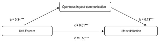 Results of mediation analysis of openness in peer communication in the relationship between self-esteem and life satisfaction; *** p < 0.001.