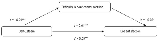 Results of mediation of difficulty in peer communication in the relationship between self-esteem and life satisfaction; *** p < 0.001; * p < 0.05.
