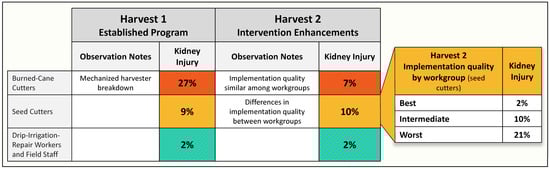 The second-year results demonstrated a reduction of 72% incidence of kidney injury over the harvest among burned-cane cutters []. While the focus on burned-cane cutters greatly improved their situation, the H2 assessment demonstrated the SC workers appeared to show no improvement, while the other groups remained stable, with very little kidney injury (Figure 2) [].
