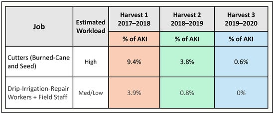Incidence of hospitalized acute kidney injury (AKI) across three harvests. Percentages based on all sugarcane workers active in each job type.